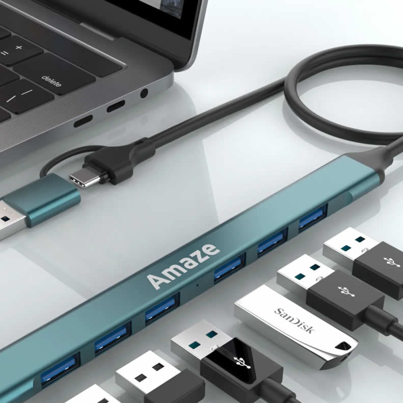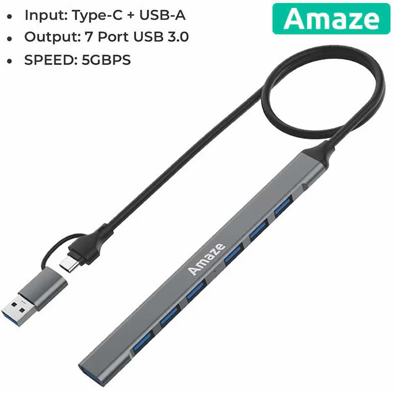 The Amaze USB + Type C 7‑Port USB 3.0 Hub is designed to expand the number of USB ports available on your computer or laptop. It provides multiple connectivity options through both Type‑C and USB interfaces, making it suitable for a wide range of devices.