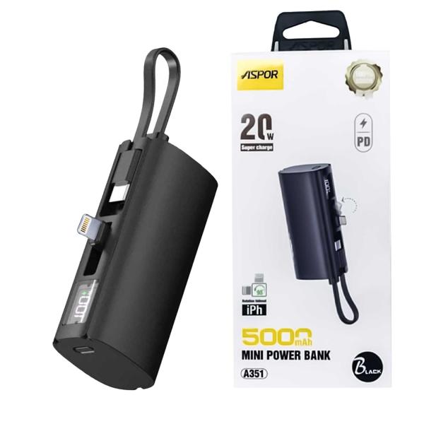 The Aspor A351 Mini Power Bank is a lightweight and portable solution for quick top-ups on the go. With a 5000mAh capacity, it’s perfect for emergency use and daily convenience. Its built-in Lightning connector and Type-C port make it compatible with both iPhone and Android devices.
