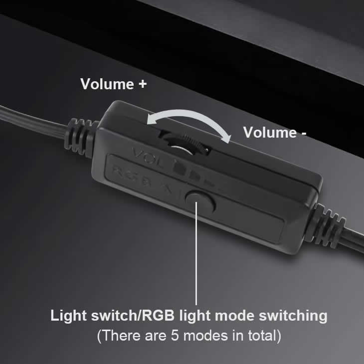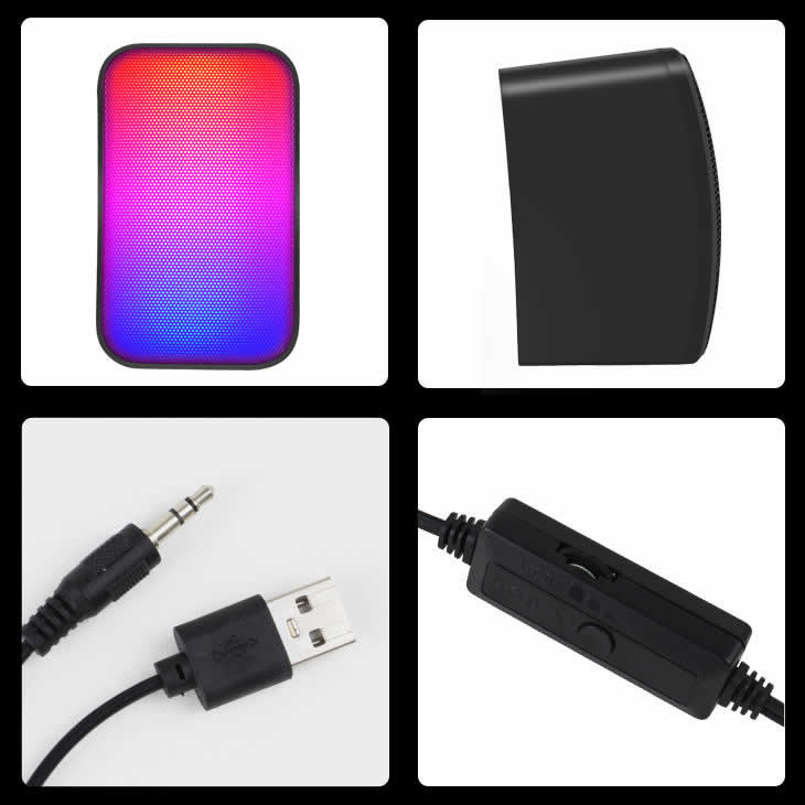 Powered via USB 5V, it connects easily to laptops and PCs without the need for external adapters. The built-in volume control switch allows for quick adjustments, and the 3.5mm AUX jack support ensures compatibility with a wide range of devices. Its compact design fits neatly on any desk, while the RGB lights add a subtle visual touch to your setup.