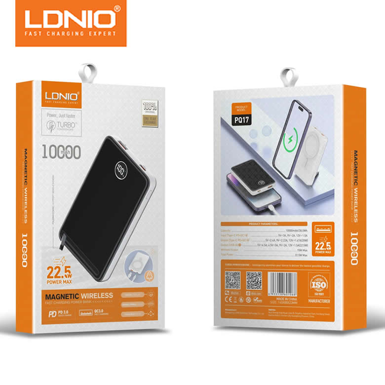 The LDNIO PQ17 Power Bank is a sleek and powerful charging solution designed for modern lifestyles. With a 10000mAh lithium-ion core and 15W magnetic wireless charging, it keeps your devices powered without the hassle of cables. The built-in Smart Automax Chip ensures optimized charging for every device, while the LED display keeps you informed of battery levels at a glance.