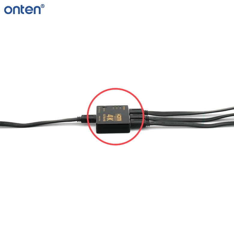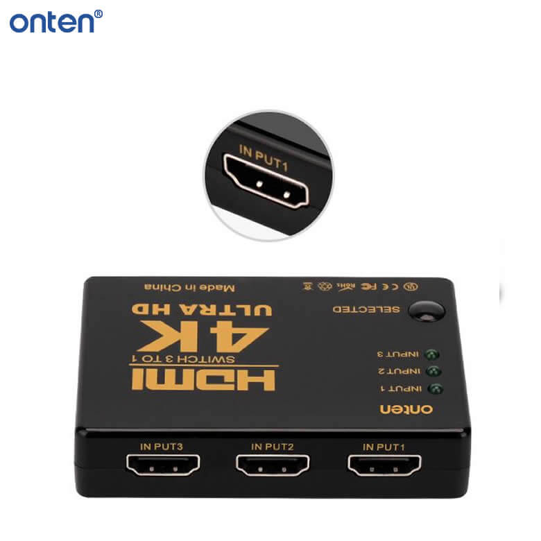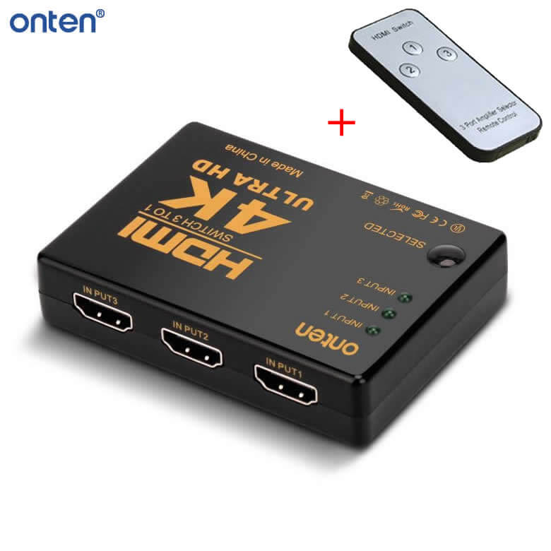 The ONTEN OTN-7593 HDMI Switch lets you connect up to three HDMI sources to a single display. With support for 4K and 2K image quality, you can switch between devices effortlessly using the included remote control.
