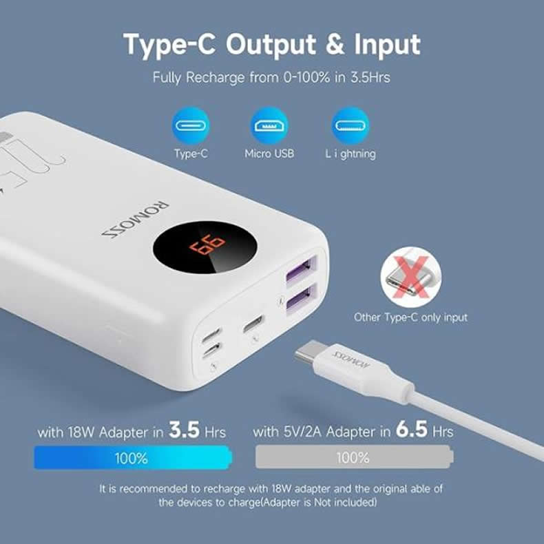 The Romoss SW10PF 10000mAh Power Bank delivers fast, efficient charging in a sleek and portable design. With support for multiple fast-charging protocols including PD, QC, FCP, and SCP, it powers up your devices quickly and safely. Featuring three input ports and three output ports, it allows simultaneous charging of multiple devices. The Type-C PD port ensures rapid charging for compatible smartphones, while the digital LED display keeps you informed of battery levels. Compact and lightweight, the SW10PF is perfect for travel, daily use, and on-the-go power needs.